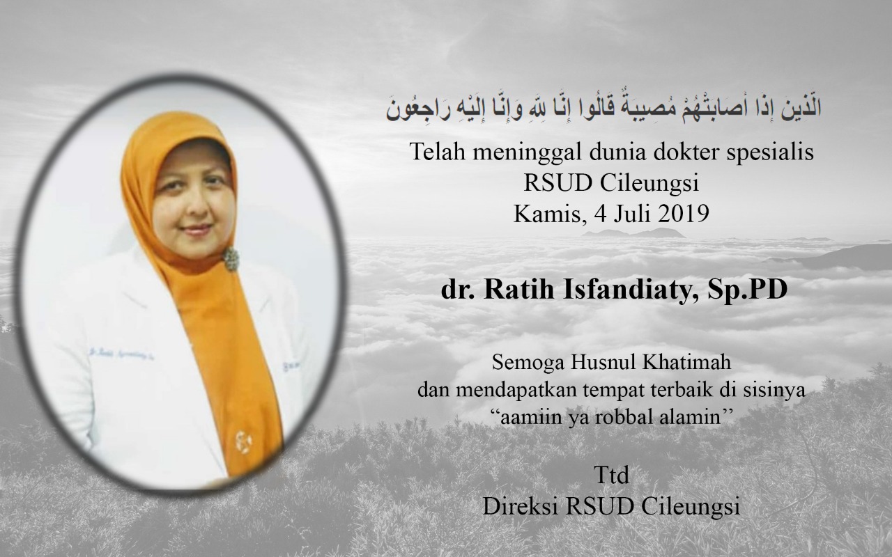 Telah Meninggal Dunia Dokter Spesialis dr.Ratih Isfandiaty, Sp.PD pada hari Kamis, 4 Juli 2019 Kami Segenap Keluarga Besar RSUD Cileungsi Mengucapkan Turut Berbela Sungkawa Sedalam-Dalamnya. Semoga Husnul Khatimah dan Mendapatkan Tempat yang Terbaik di sisi-Nya. “Aamiin Ya Robbal Alamin”